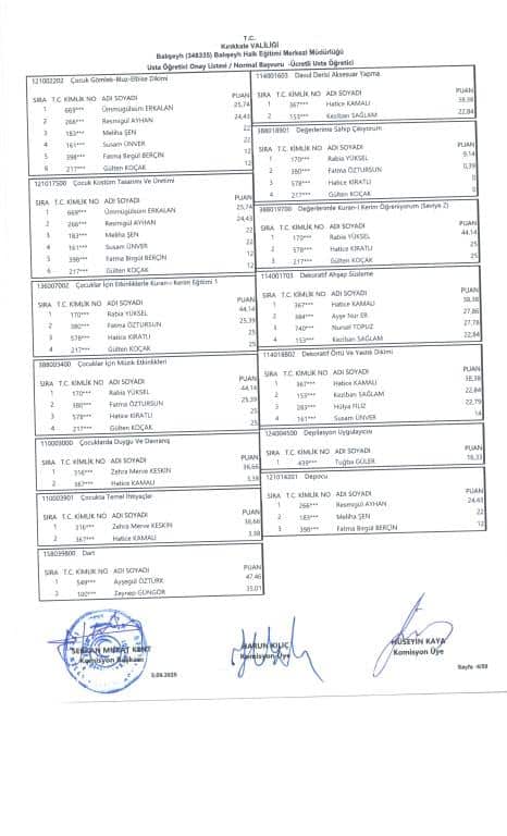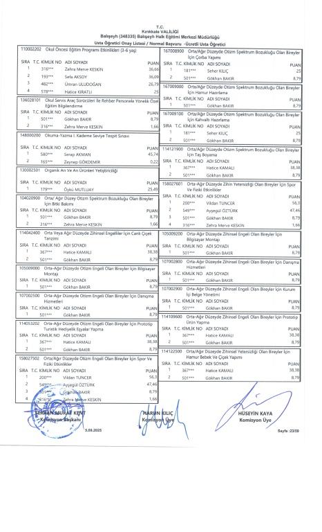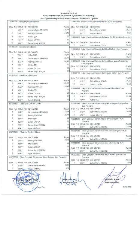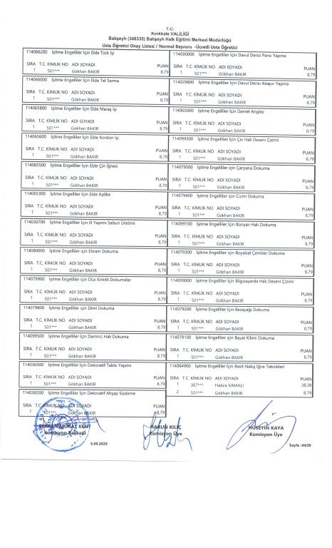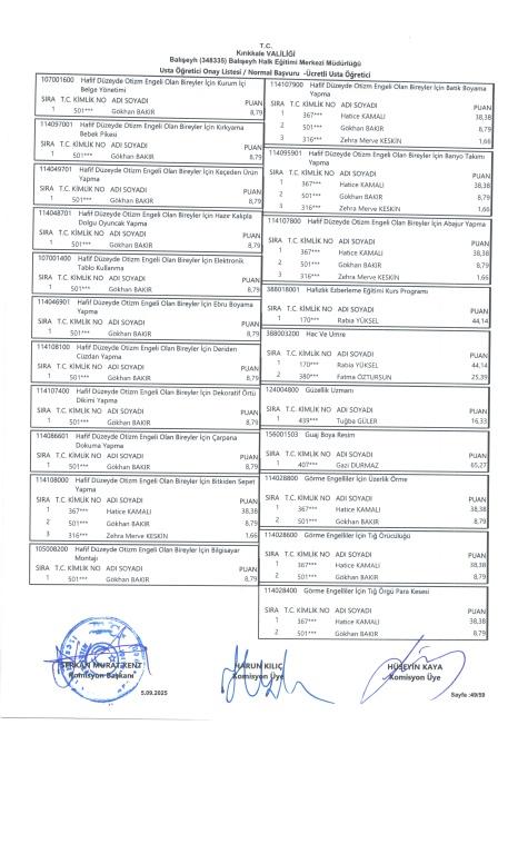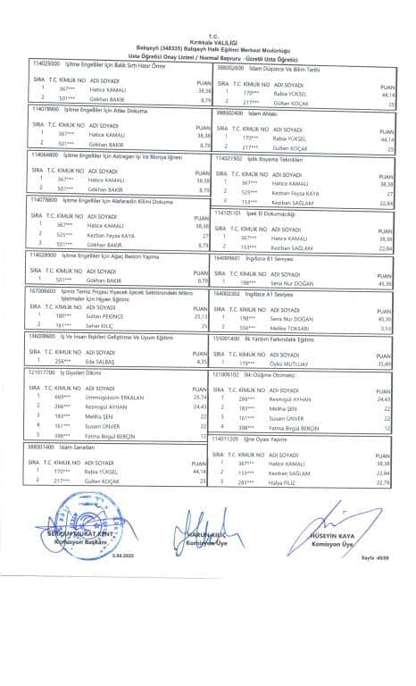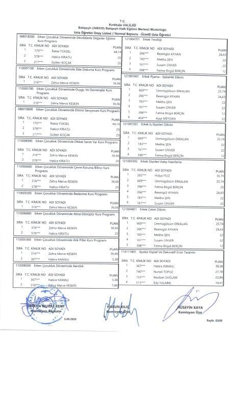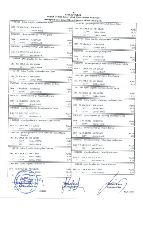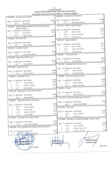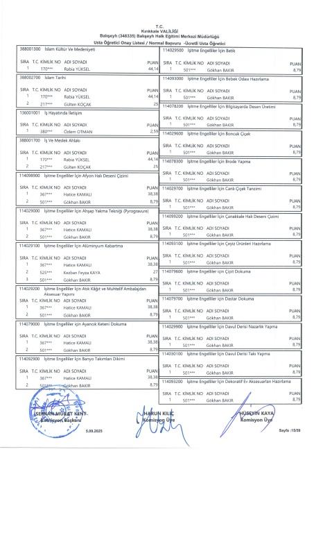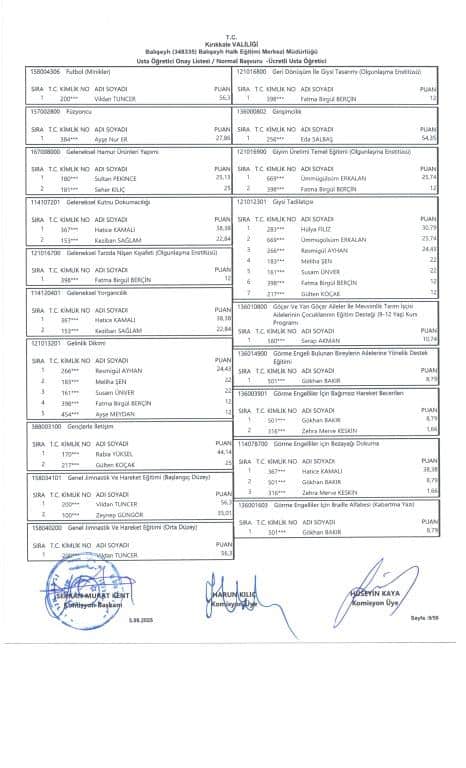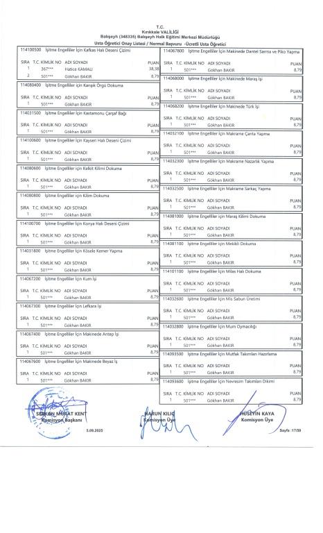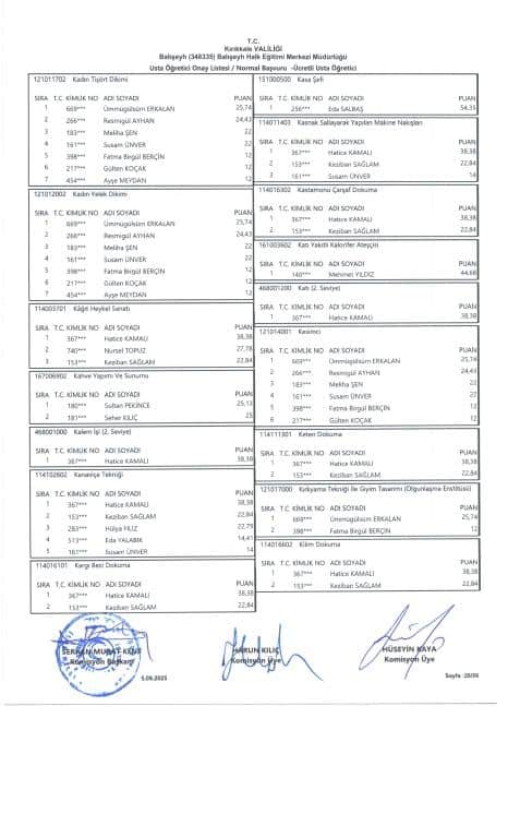 2025/2026 Eğitim Öğretim Yılı Usta Öğretici Onay Listesine aşağıda listelenmiştir . Ders Saati kotası ve fiziki ortam yetersiszliği nedeniyle açılabilecek kurslara başvuran usta öğreticilerimiz ile yayınlamış olduğumuz takvim doğrultusunda iletişime geçilecektir.