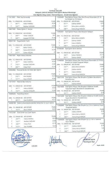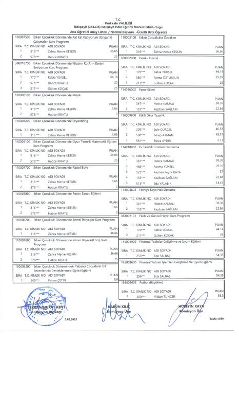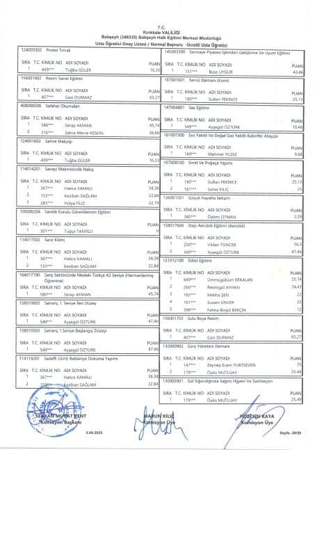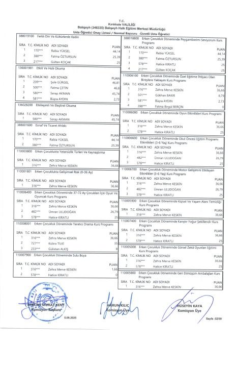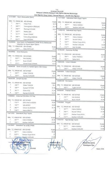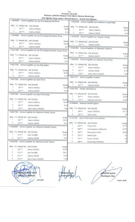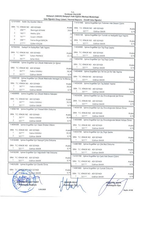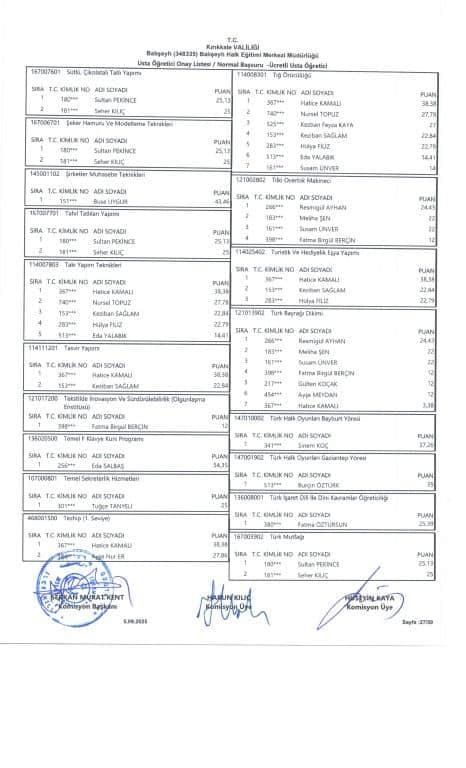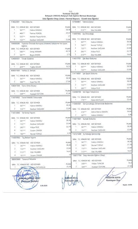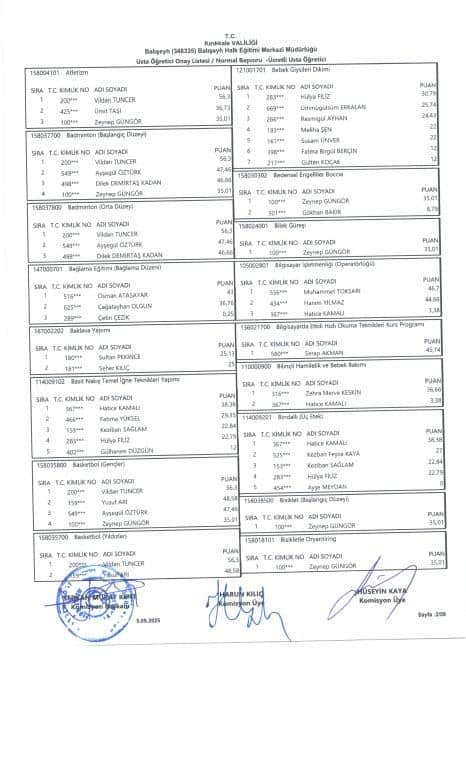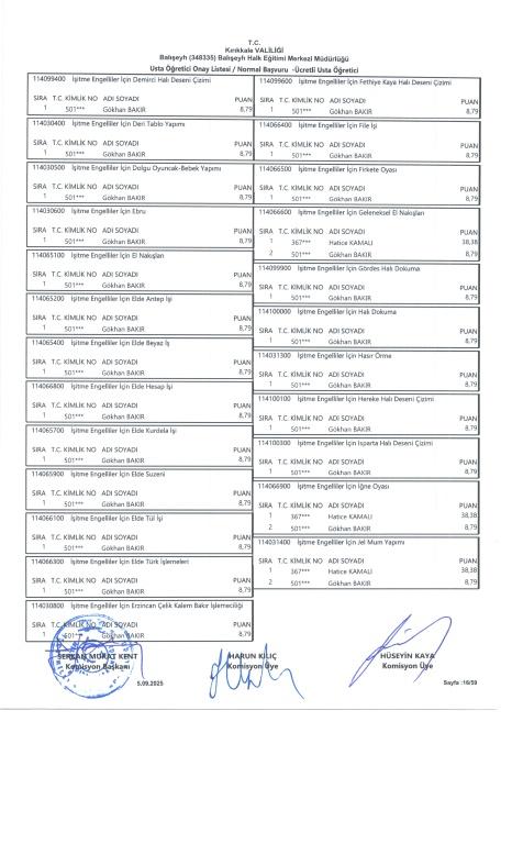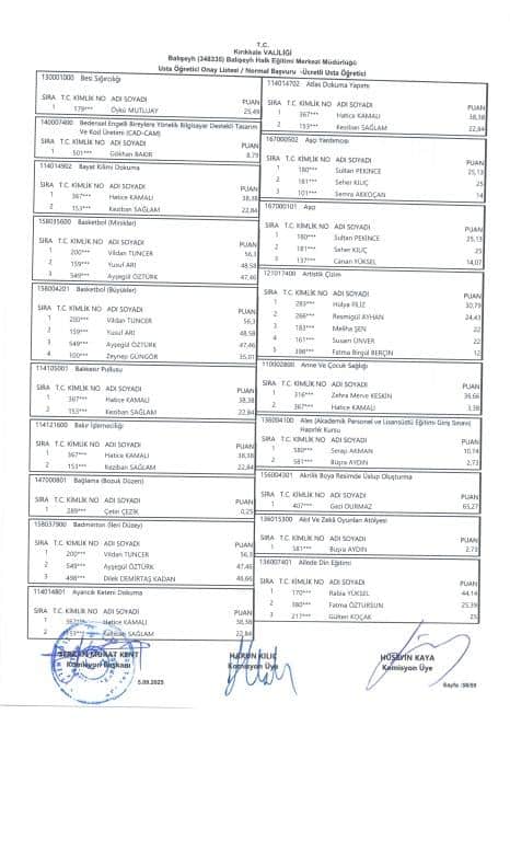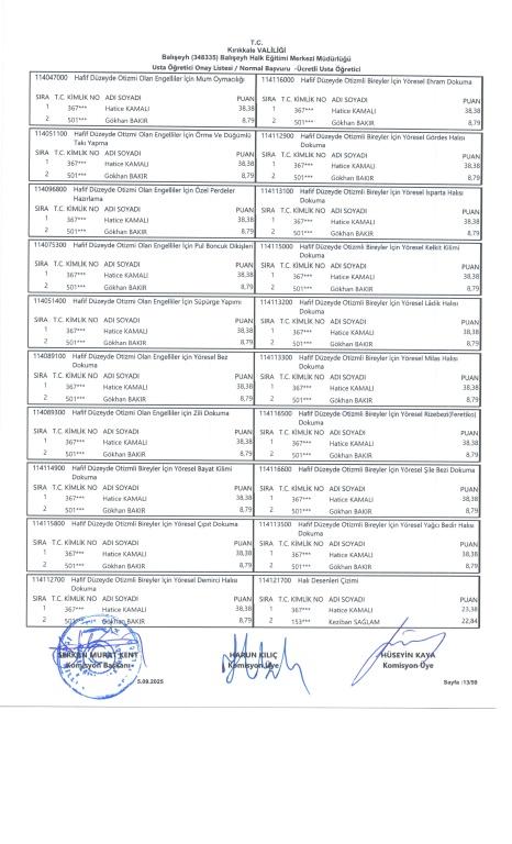 2025/2026 Eğitim Öğretim Yılı Usta Öğretici Onay Listesine aşağıda listelenmiştir . Ders Saati kotası ve fiziki ortam yetersiszliği nedeniyle açılabilecek kurslara başvuran usta öğreticilerimiz ile yayınlamış olduğumuz takvim doğrultusunda iletişime geçilecektir.